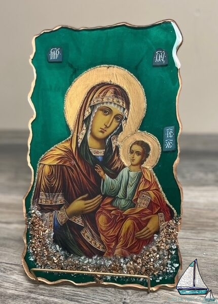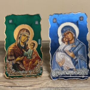 Handmade Virgin Mary Icon – Blue or Green Resin with Gold/Silver Accents