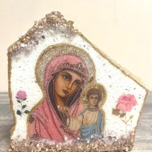 Handmade Icon of the Virgin Mary on Granite with Metallic Stand
