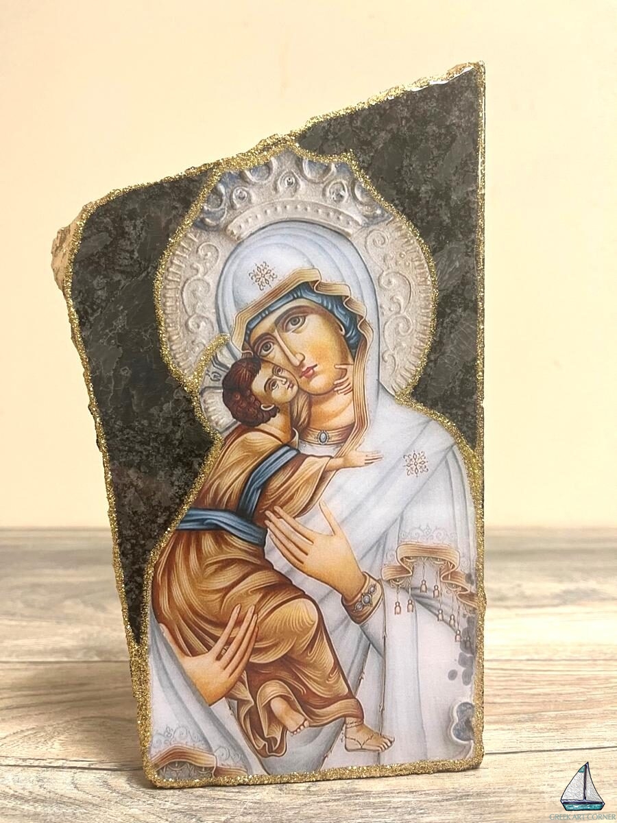 This beautiful handmade icon features the Virgin Mary and Christ Child on a piece of natural dark granite, delicately adorned with golden detailing.