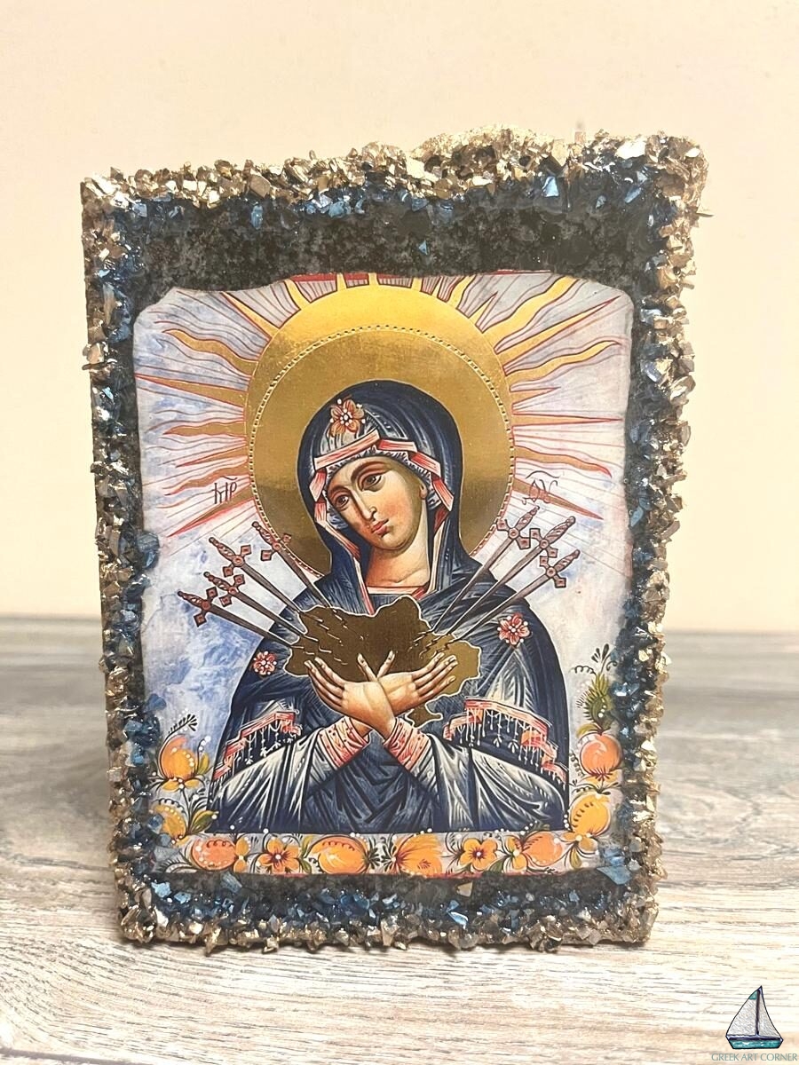 A unique handcrafted icon depicting the Virgin Mary pierced by seven swords, symbolizing her sorrow. Framed with deep blue and golden crystal-like stones, and enriched with gold detailing, this piece stands out for its emotional and aesthetic impact.