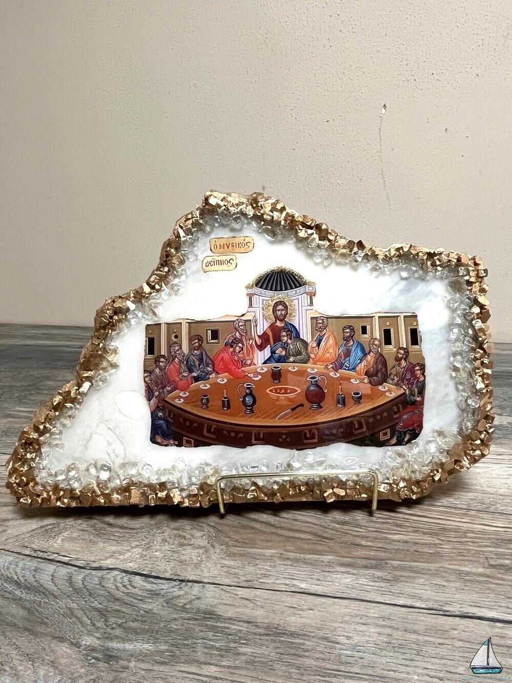 This unique handmade icon features a vivid depiction of the Last Supper, mounted on natural white granite. Surrounded by shimmering crystal fragments and gold accents, this piece beautifully combines tradition with elegant craftsmanship. The irregular natural shape of the stone enhances its uniqueness, making it both a spiritual and decorative centerpiece. Displayed on a metal stand.